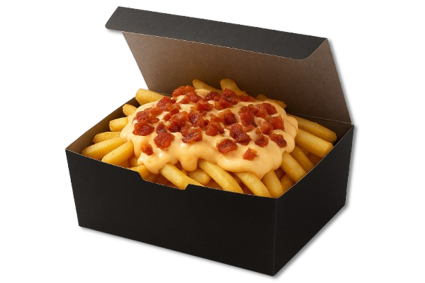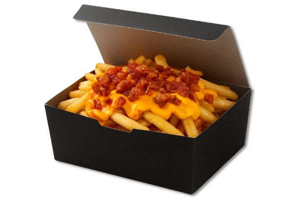 Batatas fritas douradas e sequinhas, servidas na medida certa e cobertas com cheddar derretido em abundância e bacon crocante que elevam o sabor a outro nível.